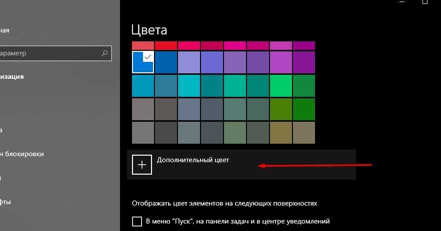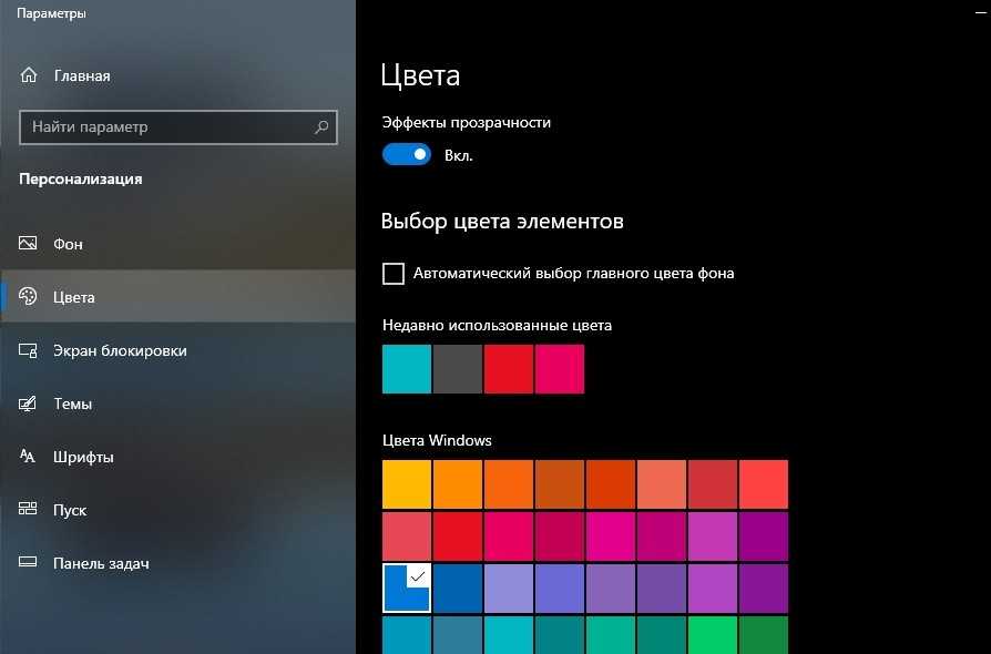 После этого еще раз зайдите в пункт настроек » Персонализация » (как это сделать было написано в самом начале статьи), где выберите любой цвет для темы Windows 10 из предложенных и еще раз убедитесь, что снята галочка » Автоматический выбор главного цвета фона «, а так же приведите параметр » Показать цвет в меню «Пуск» на панели задач и в центре уведомлений » в положение » Вкл .» (если он уже был в этом положении, то выключите и включите снова).