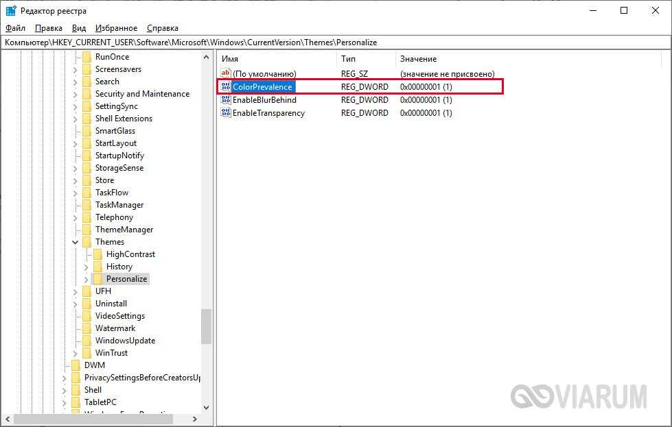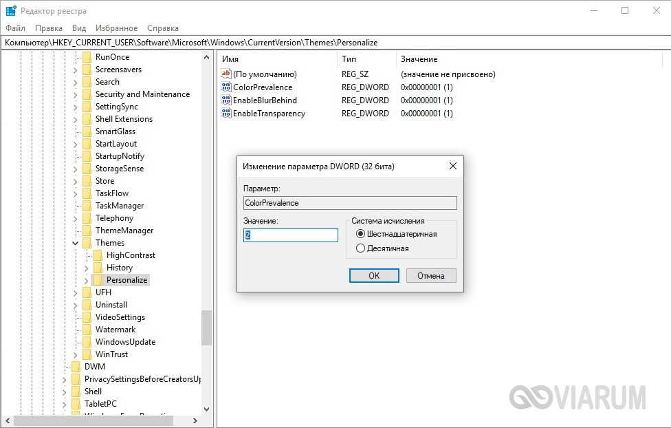 Найдите справа параметр ColorPrevalence и дважды кликните по нему. В поле «Значение» впишите 2 (по умолчанию там «0» или «1»).