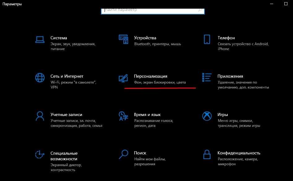 открыть подраздел «Персонализация» через блок «Параметры»;