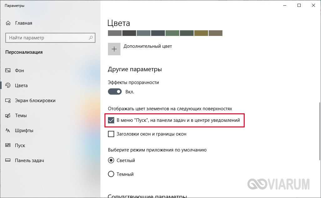 - Включите функцию «Показывать цвета при запуске, панели задач и центре действий».