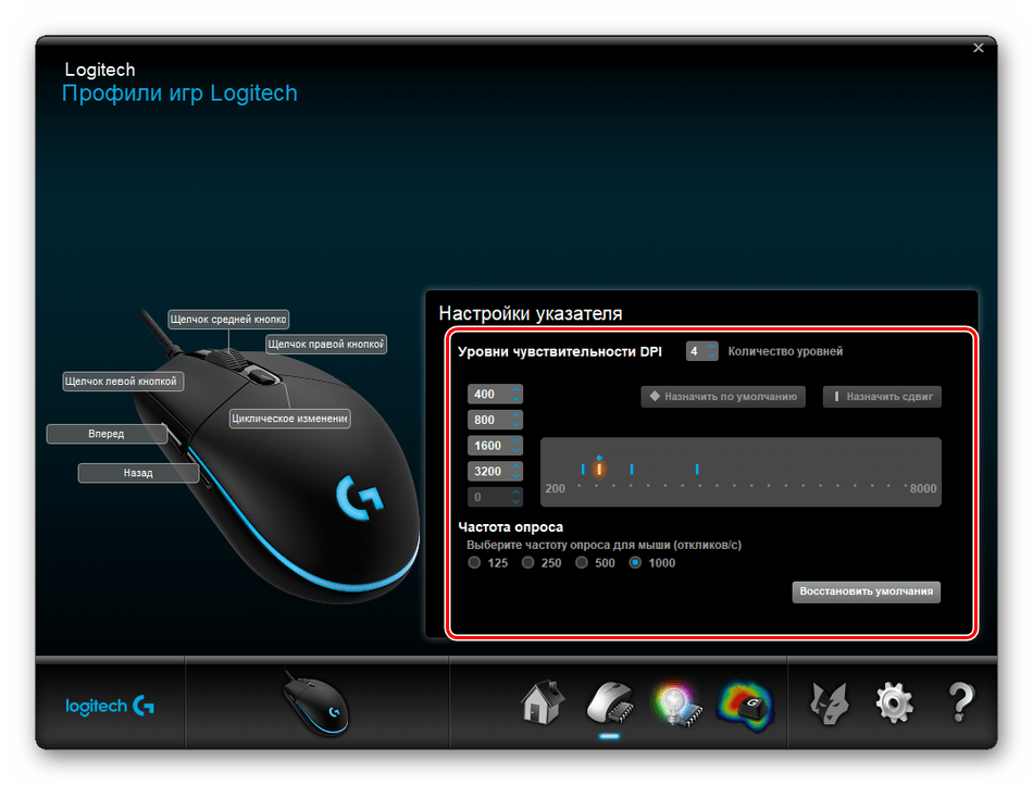 То есть, количество DPI и определяет скорость передвижения курсора по экрану. Попробуйте нажать несколько раз на эту кнопку, если она у вас присутствует, возможно, один из встроенных профилей окажется подходящим, тогда ничего изменять в системе не нужно.