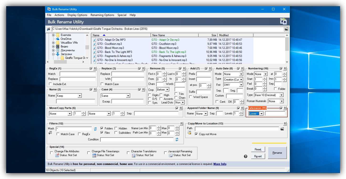 Теперь сделаем так, чтобы все расширения состояли из символов в нижнем регистре: на панели Extension выбираем вариант Lower и нажимаем Rename.