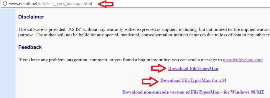 1. Переходим на сайт nirsoft.net(чтобы открылась ссылка на сайт – нужно нажать левой клавишей мыши по словам выделенным красным) => пролистав страницу почти до самого низа нужно выбрать программу для своей системы. Если у вас 32-разрядная Windows – нажимаете левой клавишей на Download FileTypesMan, если у вас 64-разрядная Windows – нажимаете левой клавишей на Download FileTypesMan for x64. Если вы не знаете какой разрядности у вас система – сначала посмотрите инструкцию 32-разрядная или 64-разрядная Windows?.