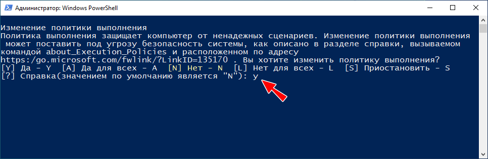 Если скрипт запросит разрешение на исполнение, введите в открывшейся консоли Y и нажмите ввод.