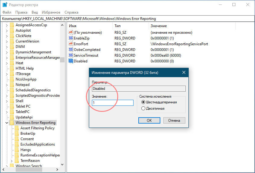 - Чтобы снова включить службу отчетов об ошибках в Windows 10, просто установите для отключенного значения значение ноль. Другим вариантом будет удалить отключенное значение.