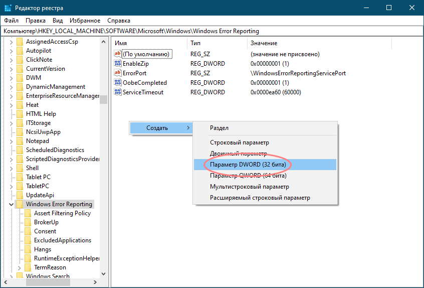 Действия по отключению службы отчетов об ошибках Windows с помощью редактора реестра