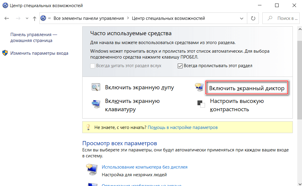 Используя «Панель управления», возможно полностью деактивировать функцию озвучивания действий на дисплее ПК: