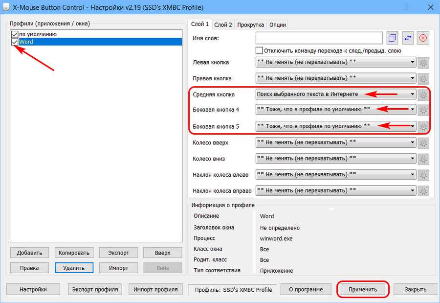 Ну и мы можем настроить в нём другие операции для мыши. При работе с Microsoft Word боковые кнопки мыши должны выполнять ту же задачу, что и в целом в системе – управление громкостью. Поэтому для них мы в настройках ставим значение согласно профилю по умолчанию. А вот операцию для средней кнопки мы переназначим. По умолчанию средняя кнопка выполняет скроллинг с регулируемой скоростью. Эта функция в нашем случае не используется, используется только обычный скроллинг колесом. На среднюю кнопку назначим операцию поиска выбранного текста в Интернете. Это привнесёт реальное удобство в работу с текстовым редактором: выделив слово или фрагмент текста, кликом средней кнопки мыши мгновенно отправим его в поисковик в браузере по умолчанию.