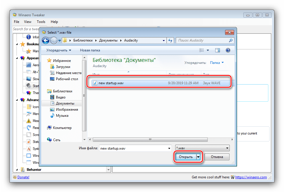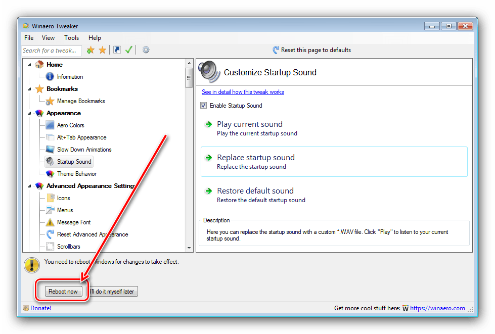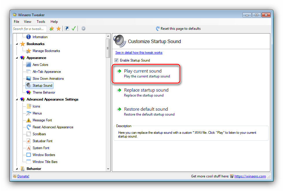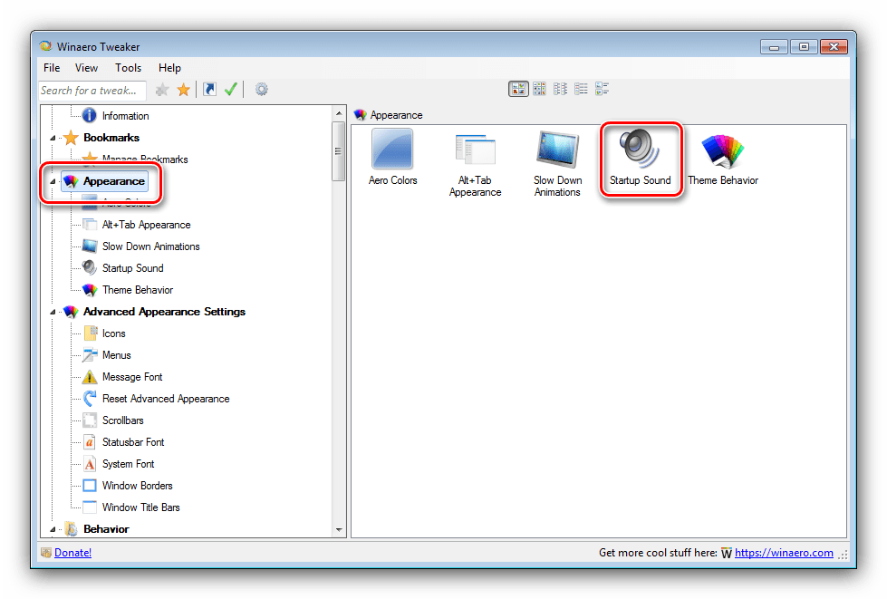 Виндовс 7 не позволяет менять мелодию напрямую – стартовая музыка считается системным файлом, инструменты для выбора которого в ОС отсутствуют. Однако существует приложение, которому под силу решить поставленную сегодня задачу – это средство под названием Winaero Tweaker.