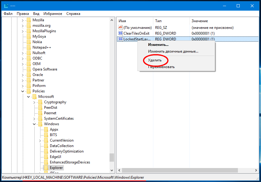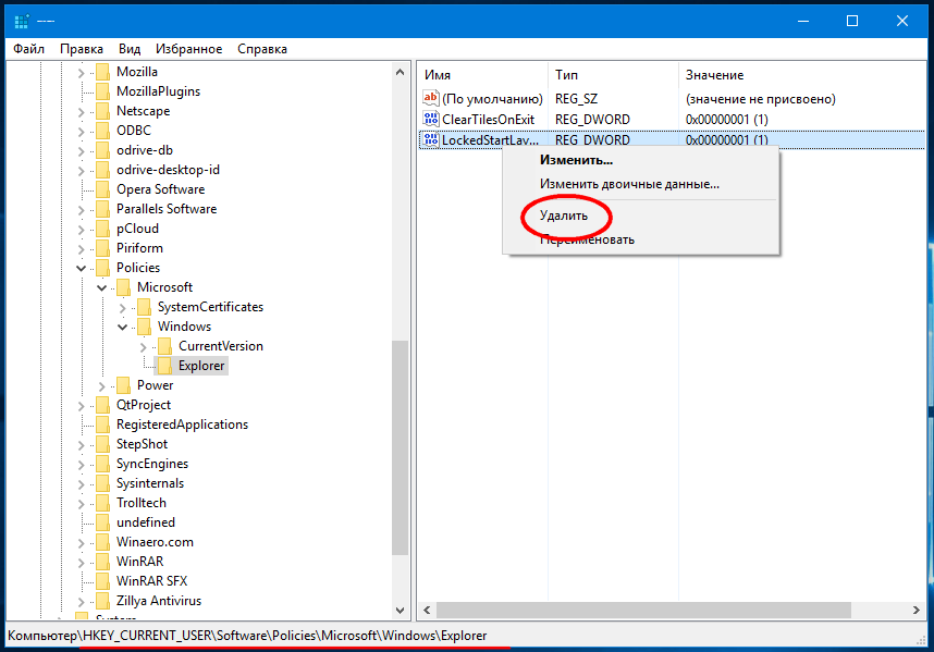 Найдите в правой области параметр LockedStartLayout и удалите его.