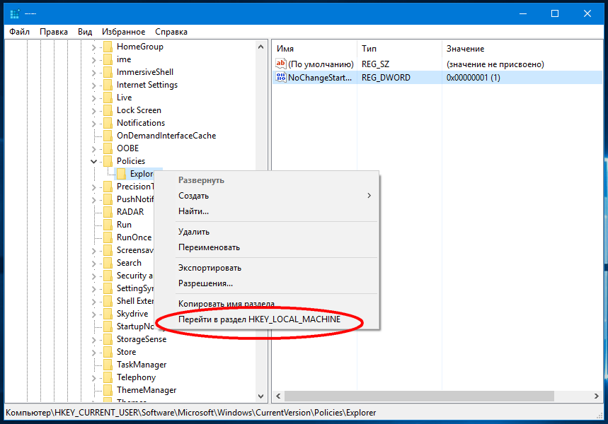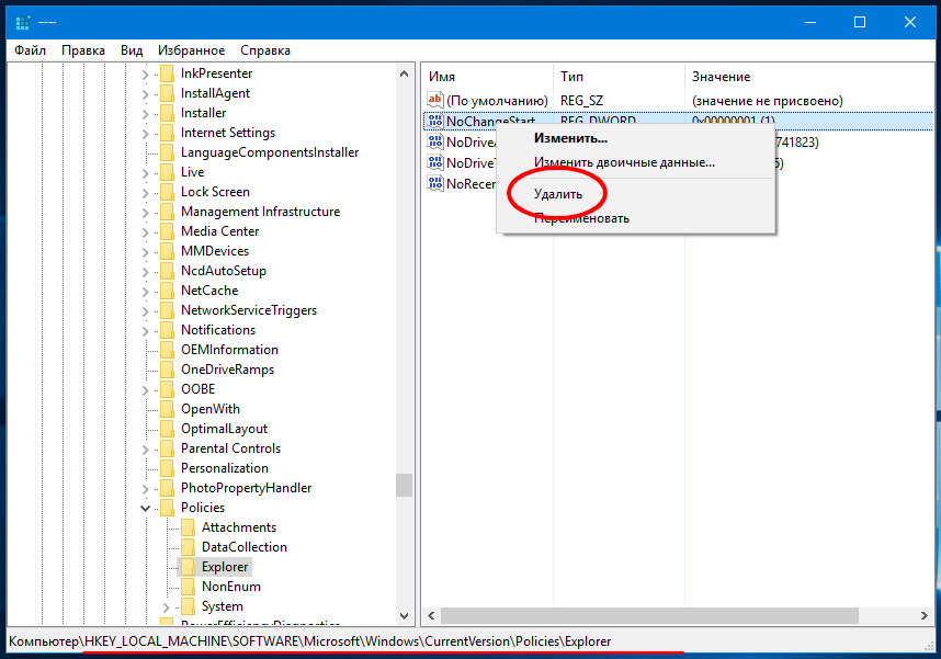 В правой части вы увидите DWORD-параметр с именем NoChangeStartMenu и значением 1. Кликните по нему правой кнопкой мыши и выберите в меню «Удалить».