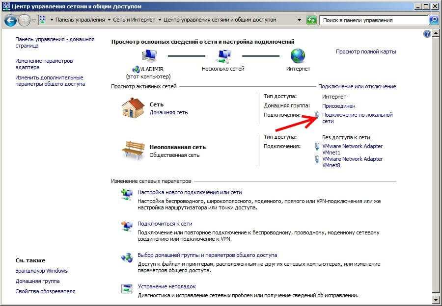 Откройте «Центр управления сетями и общим доступом». Проще всего это сделать, кликнув меню «Пуск» и набрать в поиске название меню. Также, вы можете кликнуть правой кнопкой мыши по иконке сетевого подключения в правом нижнем углу или найти данное меню в Панели управления. Нажмите на рисунок для увеличения.