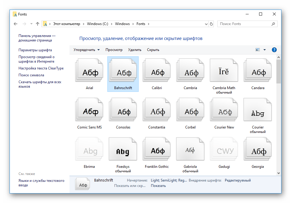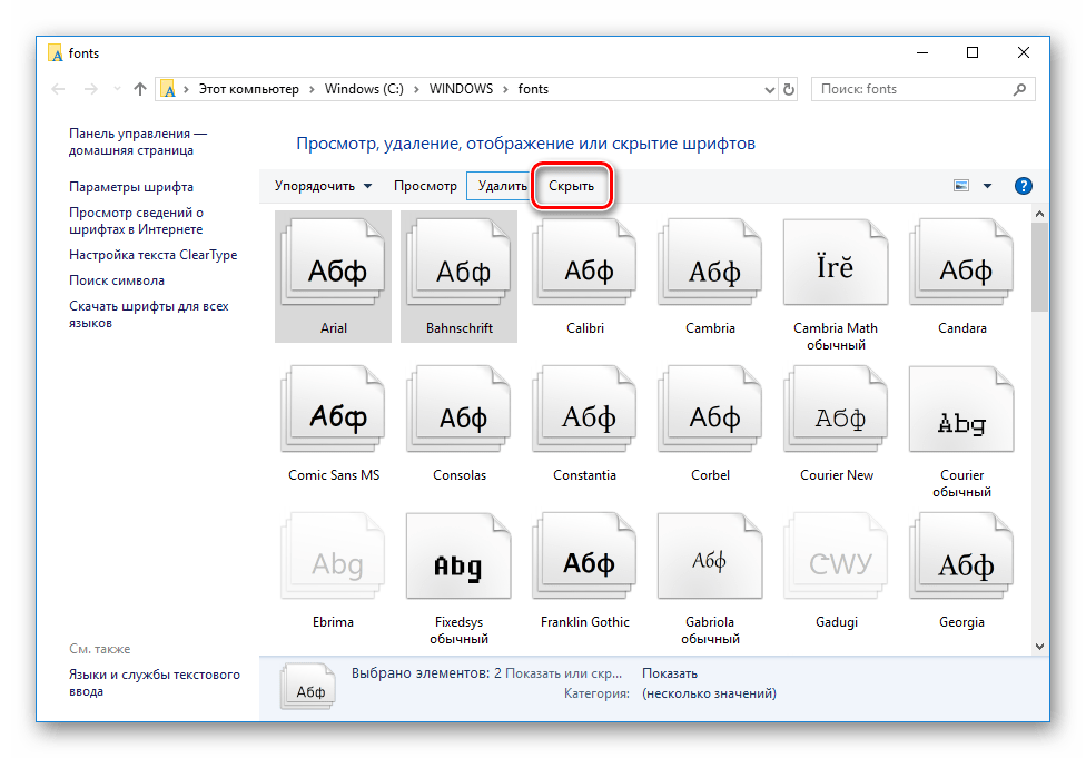 Шрифты не будут видны в программах и классических приложениях, если их скрыть на время. В таком случае доступен обход полной деинсталляции, ведь не всегда это нужно. Скрыть любой стиль можно достаточно просто. Достаточно перейти в папку Fonts, выделить файл и нажать на кнопку «Скрыть».