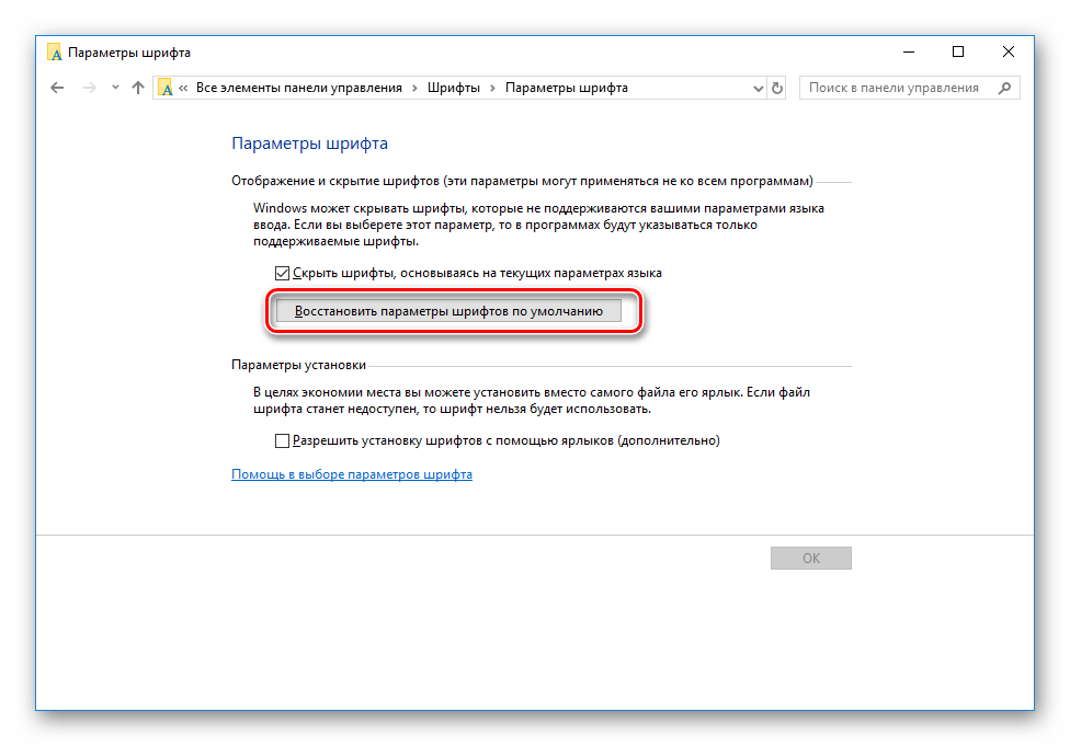 Кликните по кнопке «Восстановить параметры шрифтов по умолчанию».
