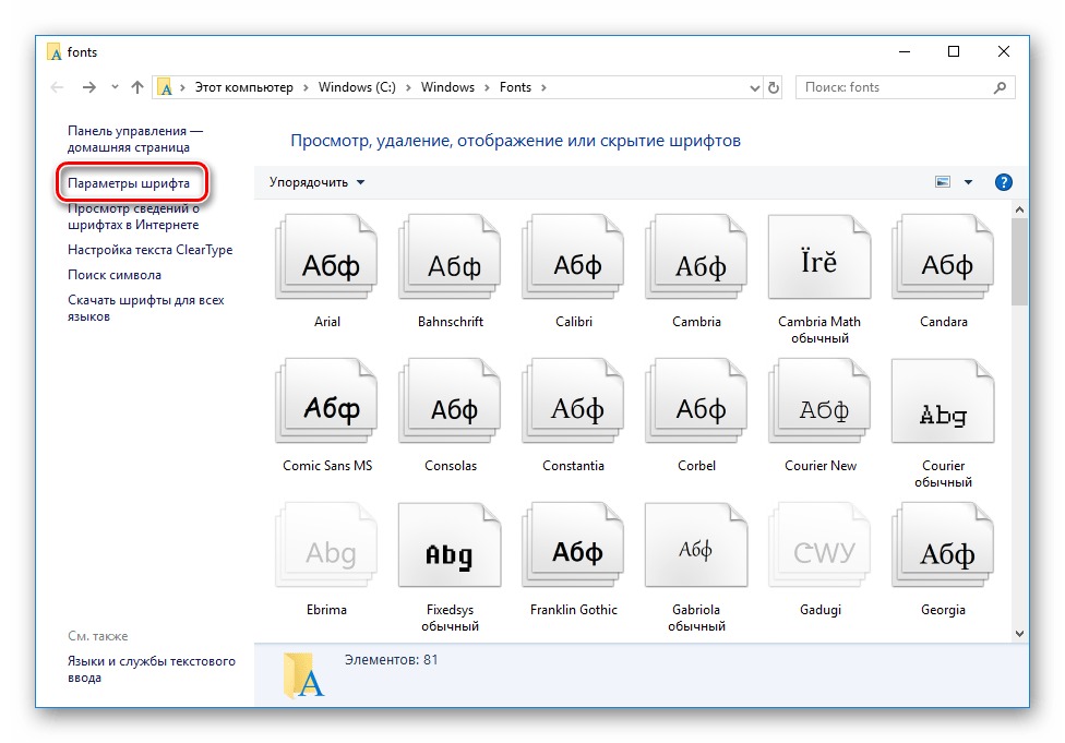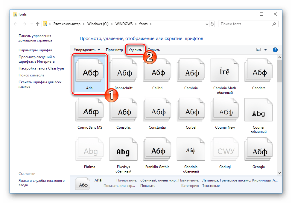 Еще одним доступным способом выступает функция удаления шрифтовых файлов через системные параметры ОС. Потребуется выполнить следующий алгоритм действий: