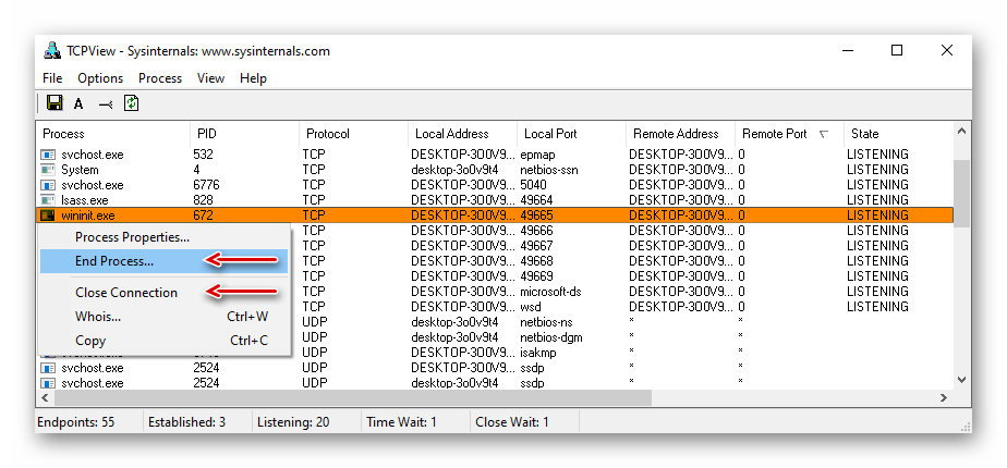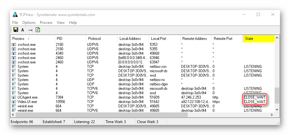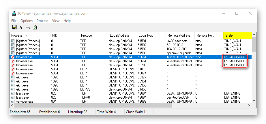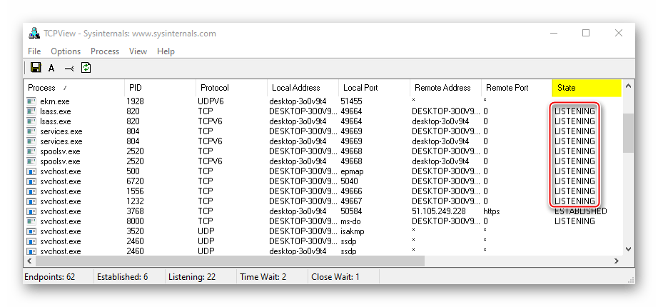 TCPView – утилита, которая отображает подробную информации обо всех открытых TCP и UDP портах в Виндовс 10. Показывает локальные и удаленные адреса, а также имена процессов, которые используют тот или иной порт. Ти Си Пи Вью не требует дополнительной настройки и установки, достаточно скачать архив и распаковать его.