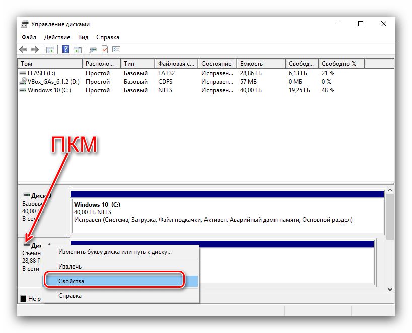 Найдите в списке дисков подключённые флешку или внешний винчестер, далее кликните правой кнопкой по серой части с надписью «Диск *№*» и воспользуйтесь пунктом «Свойства».
