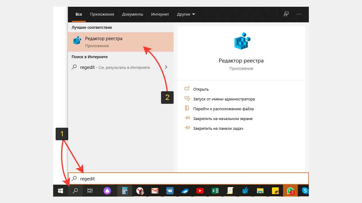 Для исправления переходим в реестр. Для этого в поиске системы набираем «regedit» и открываем «редактор реестра».