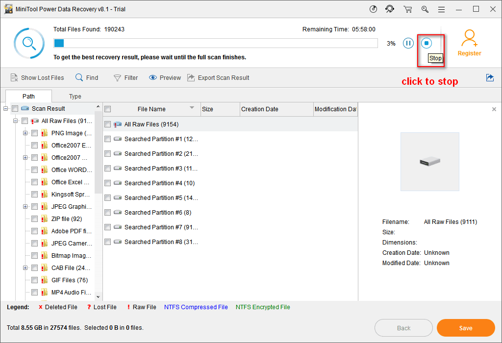 - Если он нашел нужные вам файлы, вы можете нажать на значок « Стоп », Чтобы завершить сканирование.