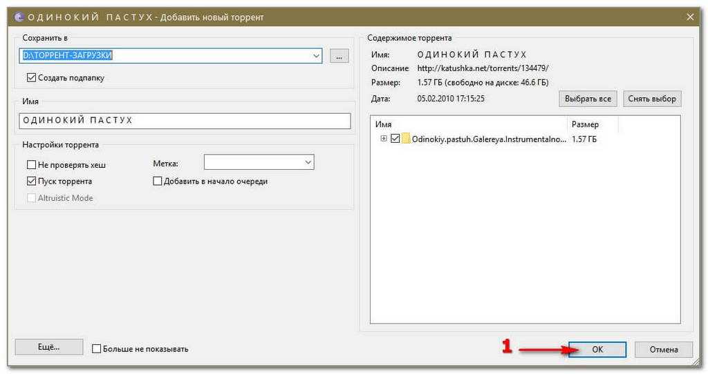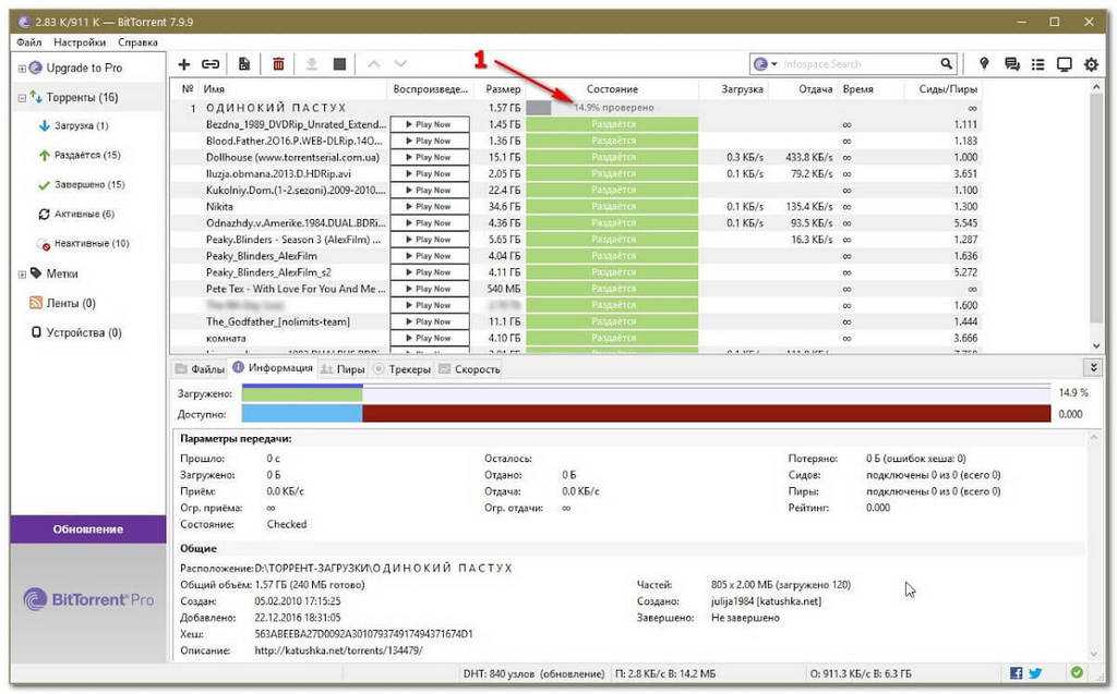 В окне программы видно, что торрент-файл добавился и программа проверяет целостность и комплектность уже загруженного файла (стрелка 1).