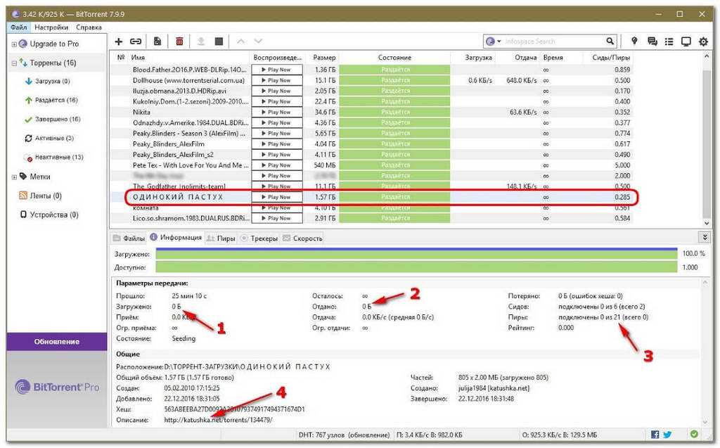 Как видно из снимка ниже, файл встал на раздачу (обведено рамкой). В разделе Информация видим, что загружено ноль байтов (стрелка 1), это значит, что загруженный файл целый и в комплекте. Отдано пока так же, ноль байтов (стрелка 2), но Пиры для скачивания этого файла есть, просто никто из них пока не активировал свой торрент-клиент (стрелка 3). Кто не помнит, Пиры – это пользователи, которые скачивают файлы, а Сиды – те, которые раздают файлы. И самое главное, торрент-файл имеет адрес торрент-трекера и расположение файла на трекере (стрелка 4).