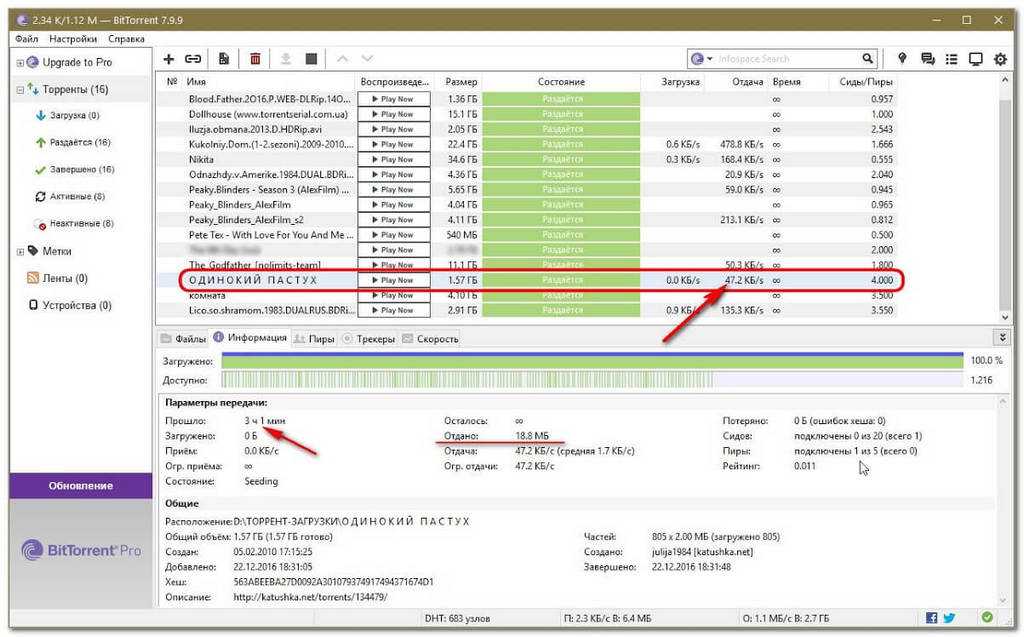 Снимок ниже свидетельствует о том, что данный способ работает и раздача этого файла началась спустя три часа. Бывает, раздача начинается сразу же, после запуска торрент-клиента (зависит от востребованности материала).