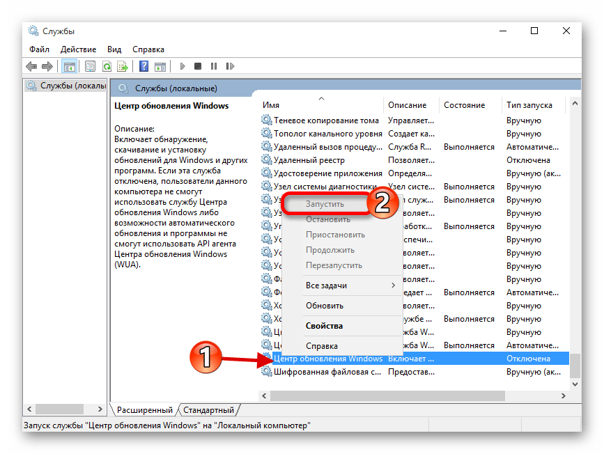 Далее вновь зайдите в «Службы» и запустите «Центр обновления Windows», выбрав соответствующий пункт в контекстном меню.