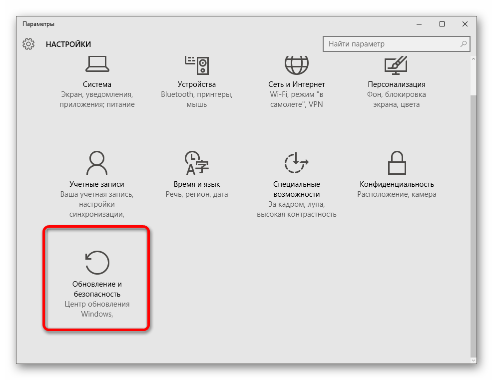 - Далее в окне с несколькими вкладками перейти в раздел «Обновление и безопасность».
