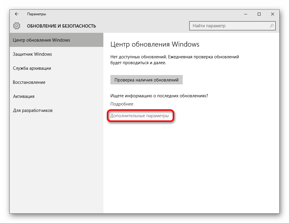 Далее нужно опуститься чуть ниже блока «Центр обновления Windows», найти строку «Дополнительные параметры» и нажать на нее.