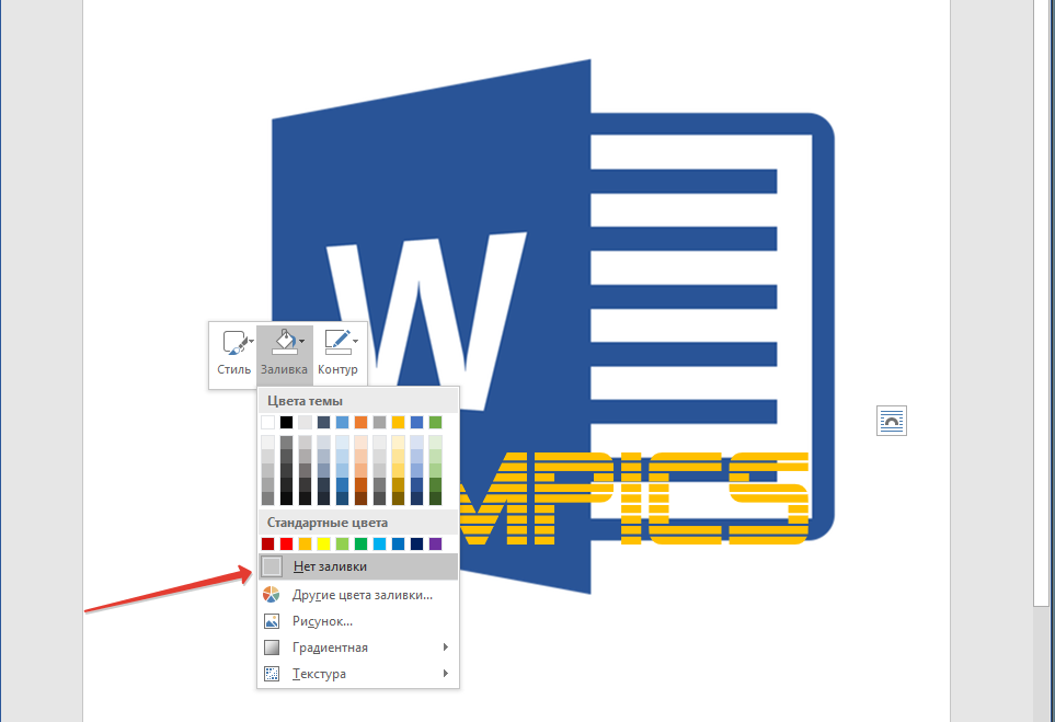 4 Для изменения цвета фона и рамки – ставим курсор на текстовом блоке и переходим: Формат -> Заливка фигуры и Контур фигуры. Если хотите вовсе убрать фон текста и рамку, то при выборе цвета укажите Нет заливки и Нет контура.
