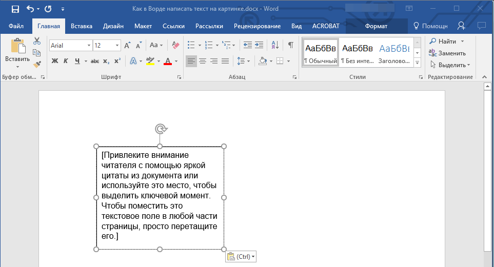 Для того чтобы вставить текст в картинку в Ворде вам нужно переместить рамку с текстом на вашу картинку. Для этого просто кликните левой кнопкой мышки на краю рамки и не отпуская кнопку мышки переместите рамку на нужное место. В результате у вас должен получится примерно такой результат, как на скриншоте внизу.