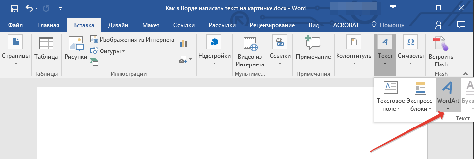 Для того чтобы этот текст отобразился на картинке, необходимо добавить любое фото и потом перенести надпись на само изображение. Делается это так. Вы нажимаете на вкладку Вставка, добавляйте рисунок. Когда он будет добавлен, удерживайте левой кнопкой мыши, созданный текст, и переносите его на фотографию.