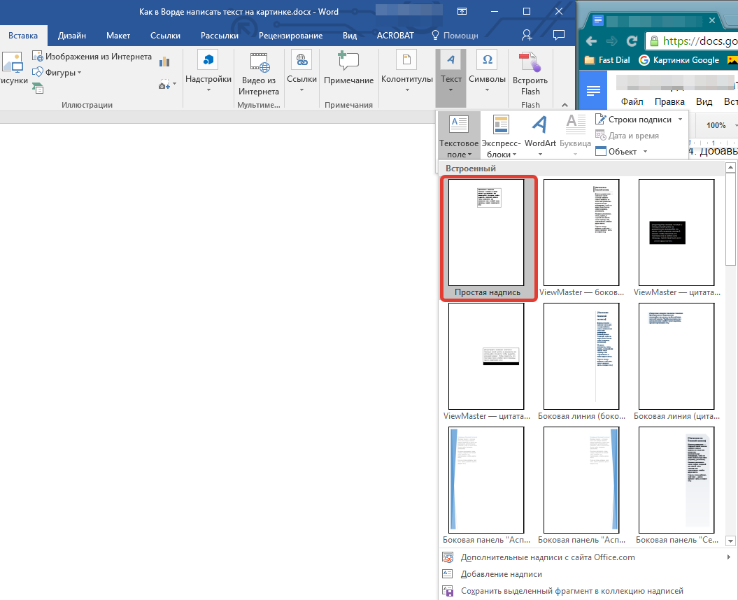 Самый простой способ написать текст на картинке в ворде — воспользоваться инструментом «Надпись». От вас требуется открыть Microsoft Office Word нажать на вкладку «Вставка», кликнуть по кнопке «Надпись» и выбрать «Простая надпись».