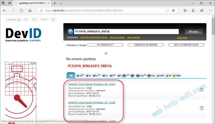 В строку поиска вставляем скопированный код. Дальше нужно сократить код (удалить кусок с конца). Изначально у меня был «PCI\VEN_8086&DEV_08B3&SUBSYS_00708086&REV_83». Удаляем код с конца, оставив только «PCI\VEN_8086&DEV_08B3&». Нажимаем на кнопку поиска.