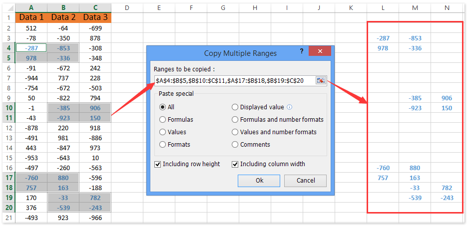 2, нажмите Ctrl + C клавиши, чтобы скопировать эти несмежные строки, затем выберите первую ячейку целевого диапазона и нажмите Ctrl + V ключи для вставки этих строк. Смотрите скриншот выше: Скопируйте и вставьте несколько несмежных столбцов, как показано на скриншоте ниже: