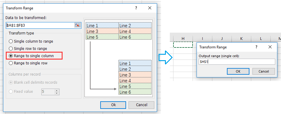 2. в Диапазон преобразования диалог, проверьте Диапазон до одного столбца и нажмите Ok, затем выберите ячейку для размещения результатов. Смотрите скриншот: