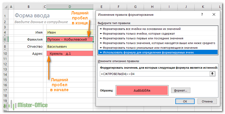 Функция СЖПРОБЕЛЫ убирает из текста начальные и конечные пробелы. И если после такого «сжатия» оказалось, что текст «до» не совпадает с текстом «после», значит, имеются лишние пробелы в начале или в конце. Такие данные и будут соответствующим образом помечены.