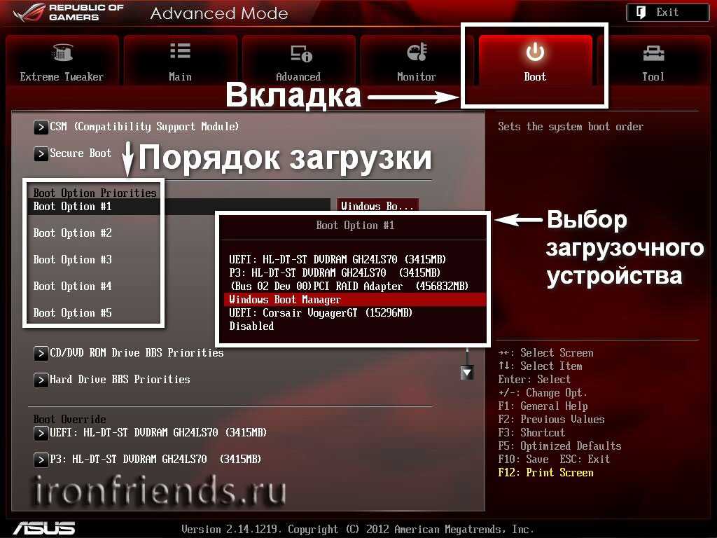 Видим меню Boot Priority Order и слева инструкцию о том как менять порядок, в общем стрелками вверх/вниз выбираете нужный пункт и клавишами + и — поднимаете его в списке или соответственно отпускаете: