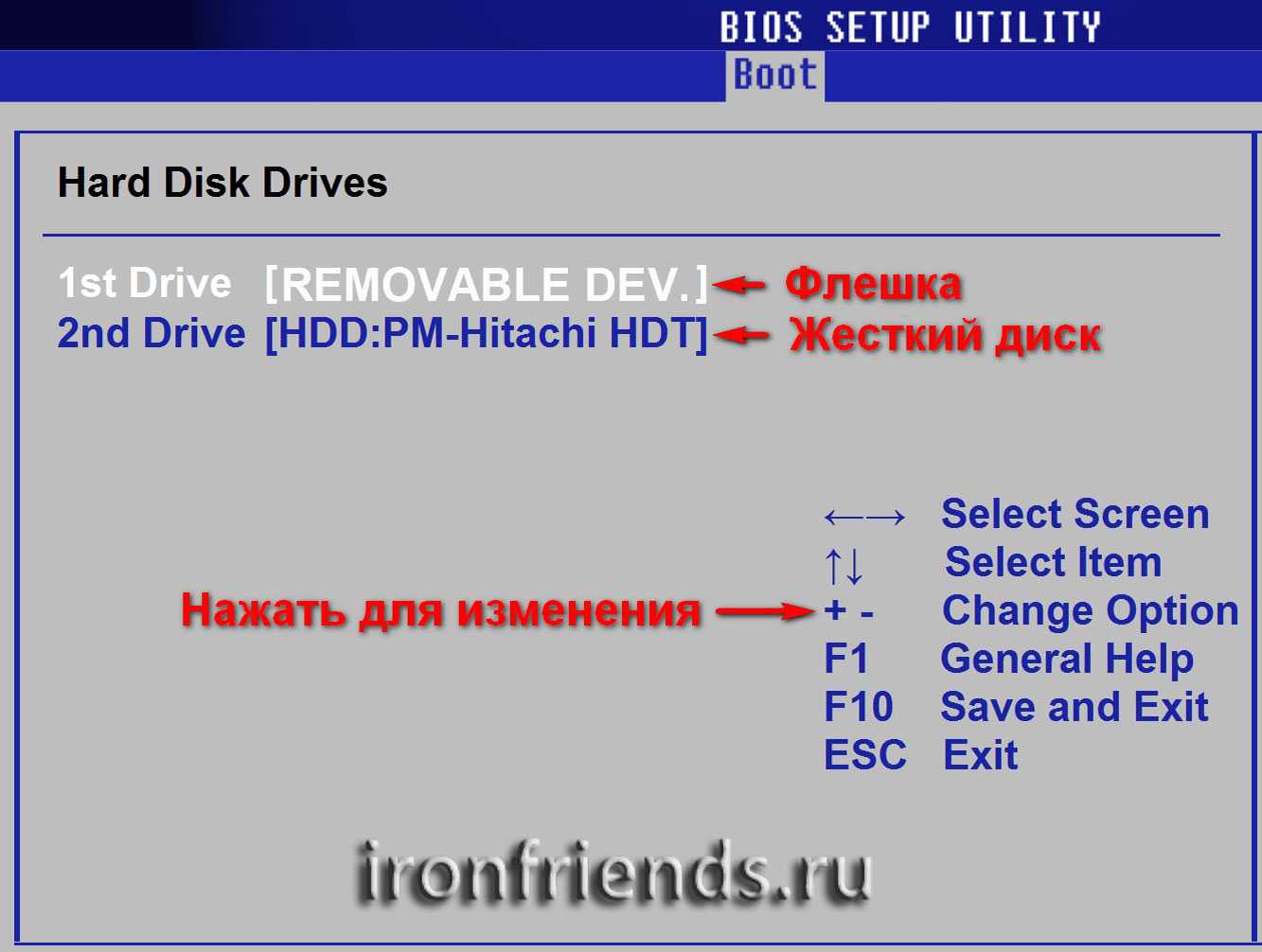 Второй вариант чаще всего встречается на старых компьютерах, тут в Boot Device Priority выстраиваются по списку типы устройств — жесткие диски, флешки, сеть и т. д., а в пункте Hard Disk Drives, который не всегда находится рядом можно настроить приоритет загрузки уже с конкретных устройств: