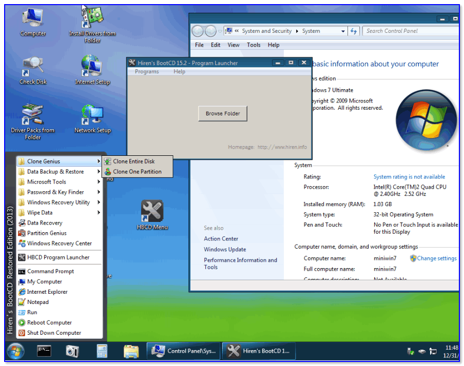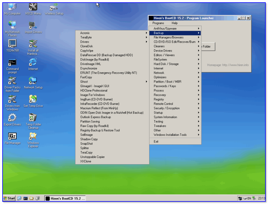 Hiren’s BootCD PE – этот диск основан на ОС Windows XP (урезанной версии) с полным комплектом различных программ. Позволяет относительно спокойно пользоваться ПК (в том числе и сетью) просто загрузившись с флешки.