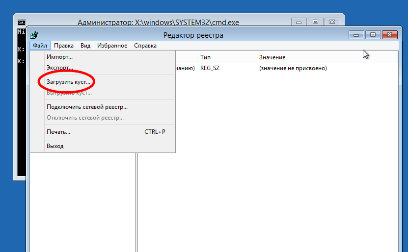 В открывшемся редакторе сразу выделяем ветку реестра «HKEY_LOCAL_MACHINE» и во вкладке «Файл» нажимаем «Загрузить куст».