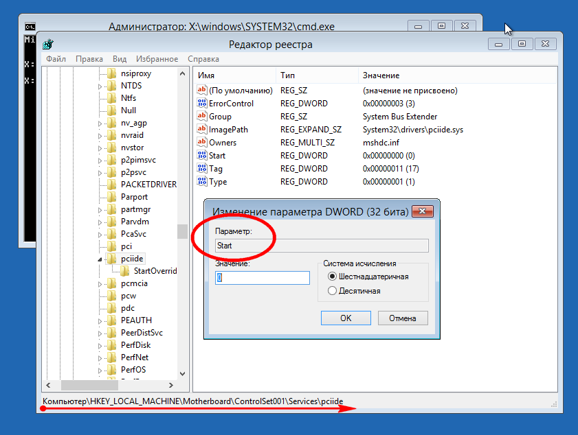 Затем точно таким же способом заходите в папку «pciide» раздела «services» и меняйте значение параметра «Start» на «0».