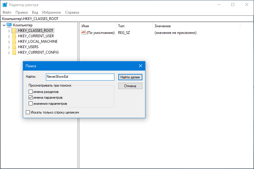 Затем нажмите Enter. Справа дважды щелкните HideFileExt.