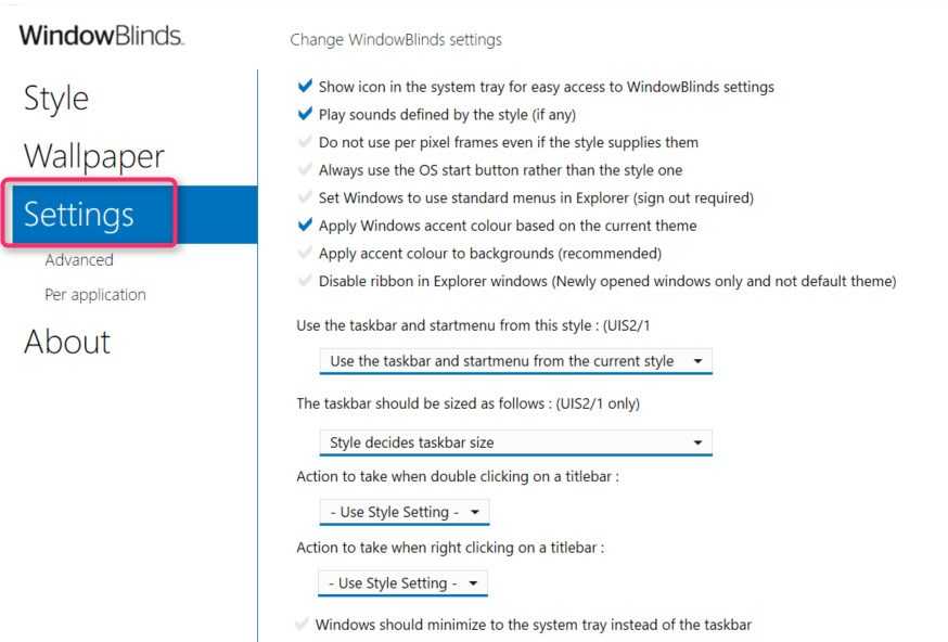Во вкладке «Settings» содержатся настройки оформления Windows. Среди них: