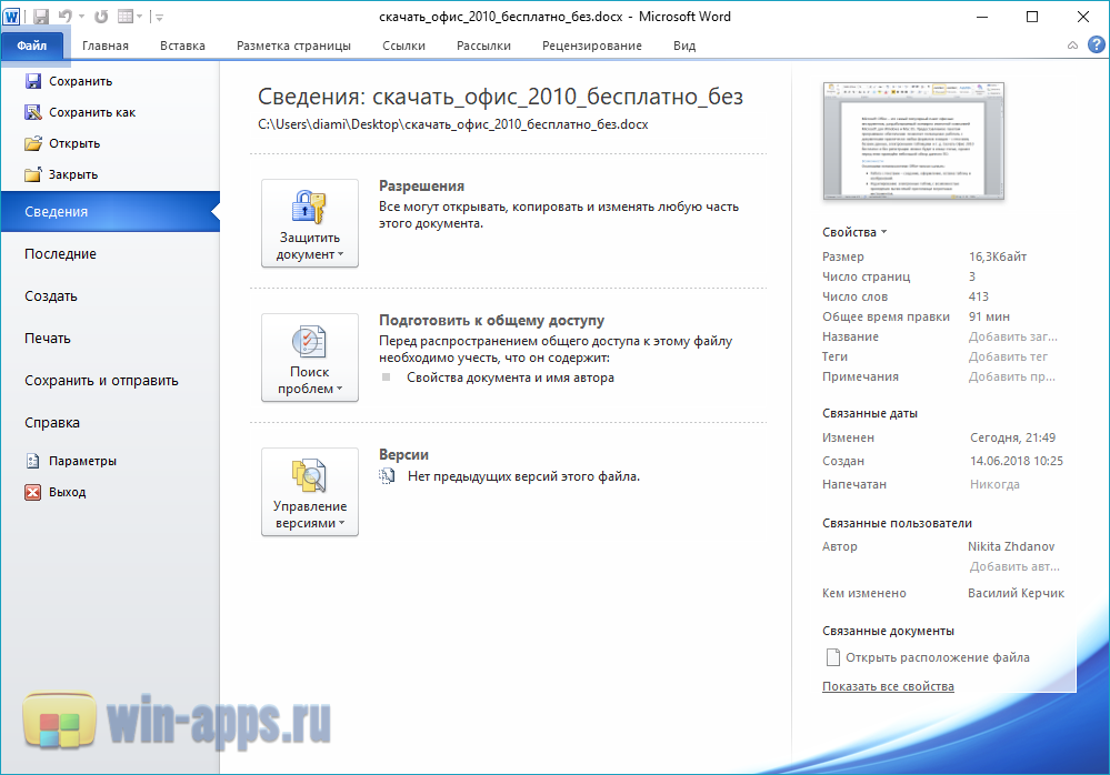 Еще один вариант, который поможет вам вернуть документ MS Office, — это восстановление документов Word из предыдущей версии. В Windows 7 и более современных операционных системах System Restore автоматически создает резервные копии каждый раз, когда создается новая точка восстановления. Это означает, что функция System Restore должна быть включена (обычно она активирована по умолчанию). Если отключить ее вручную, то восстановить данные станет невозможно. Вы можете проверить наличие резервных копий файла. Для этого следует нажать на файле правой кнопкой мыши, выбрать Properties и вкладку Previous Versions. Если такая вкладка отсутствует, значит, функция System Restore отключена. Все ранее сохраненные версии будут отображаться в списке.