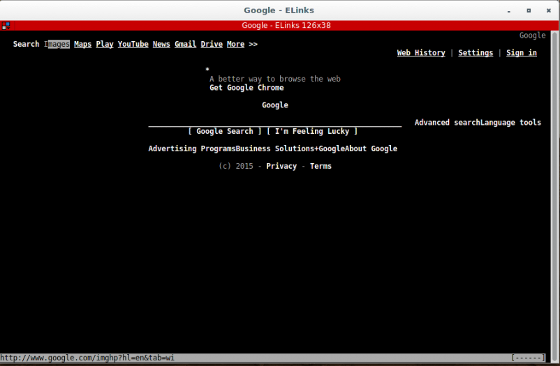 Еще одно ответвление консольного браузера Links с более усовершенствованным функционалом. Только вот внешне он ничем не изменился — по умолчанию остался таким же черно-белым. Хотя когда-то говорилось, что цветной интерфейс с загрузкой графики все же поддерживается в Links2, да и JavaScript имеется. Для отображения картинок и прочих графических элементов необходимо запускать его из командной строки с ключом -g.