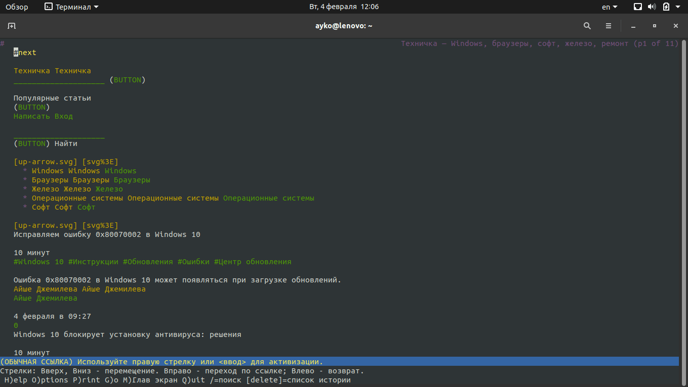 Для открытия браузера в ОС Linux необходимо ввести команду lynx или lynx <URL-адрес>. Для перемещения по элементам используется курсор и кнопки вверх-вниз. Перейти по активной гиперссылке (подсвечивается зеленым) можно нажатием на кнопку «вправо» на клавиатуре, а кнопка «влево» вернет на предыдущую страницу. Вот некоторые клавиши и их комбинации, запускающие актуальные команды.