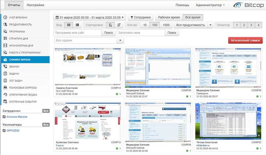 - автоматическое выполнение скриншотов, позволяющее отслеживать действия сотрудника;