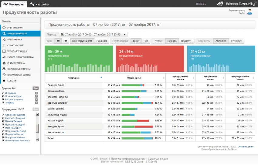 При использовании Bitcop для контроля за компьютерами сотрудников могут быть решены следующие основные задачи по конечной оценке количества и качества выполняемых работ (с применением одноименных отчетов):
