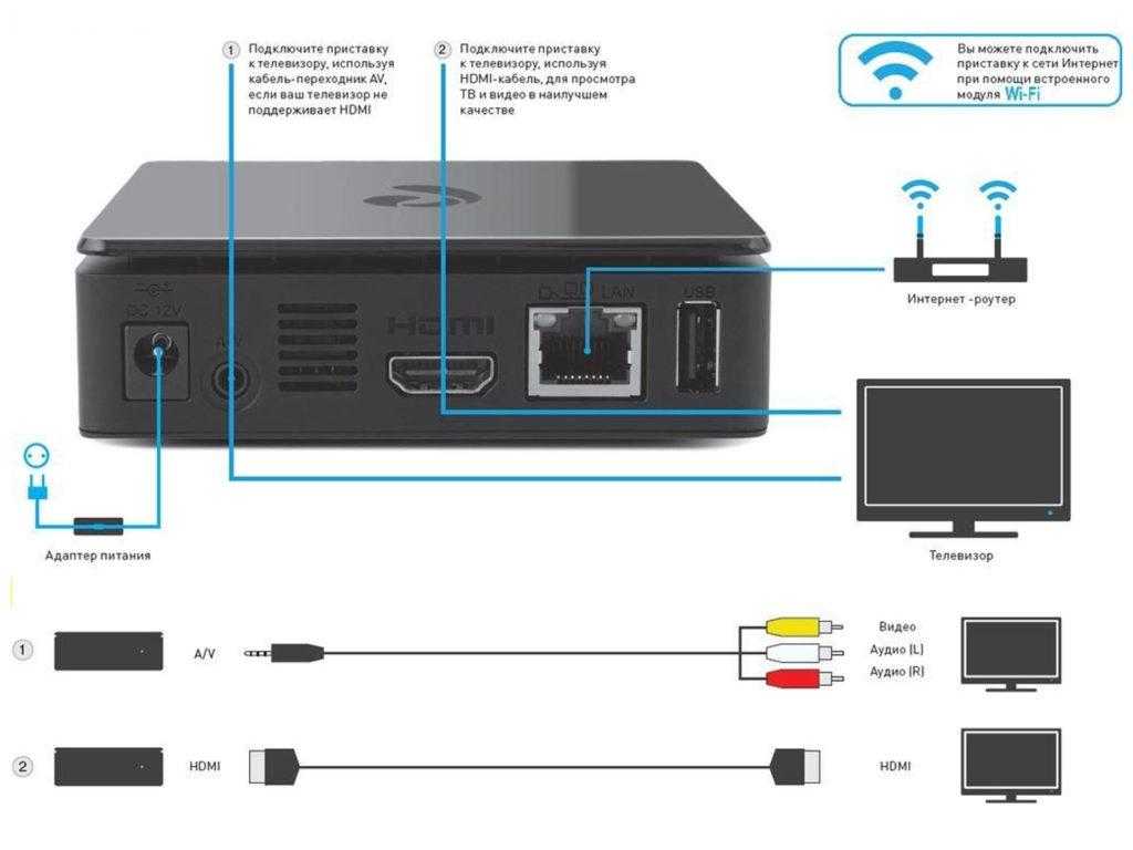 У STB-приставок два варианта подключения к телевизору: через HDMI или S-кабель (“тюльпаны”). В первом случае качество изображения значительно выше, второй подходит даже устаревшим моделям ТВ.